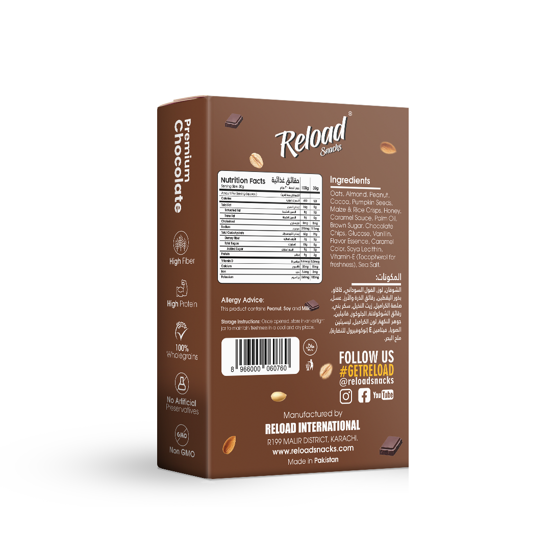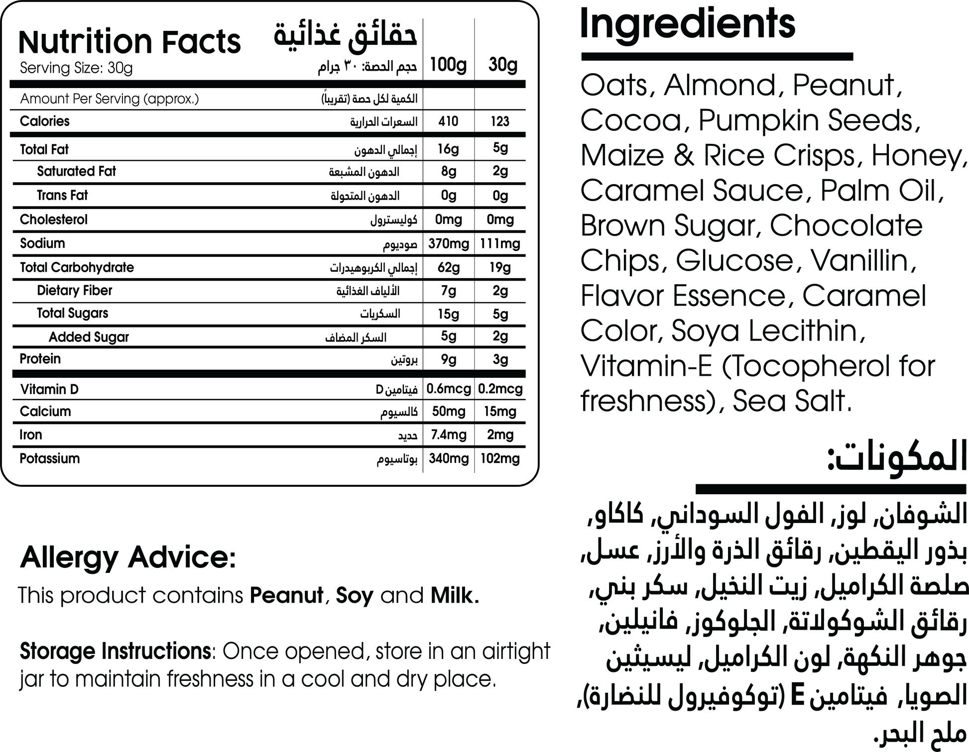 Oats, Cocoa, Almond, Brown Sugar, Maize and Rice Crisps, Chocolate Chips, Honey, Pumpkin Seeds, Peanut, Honey, Palm Oil, Soy Lecithin, Glucose, Sea Salt, Caramel Color, Vitamin-E (Tocopherol), Caramel Sauce, Vanillin, Flavour Essence.