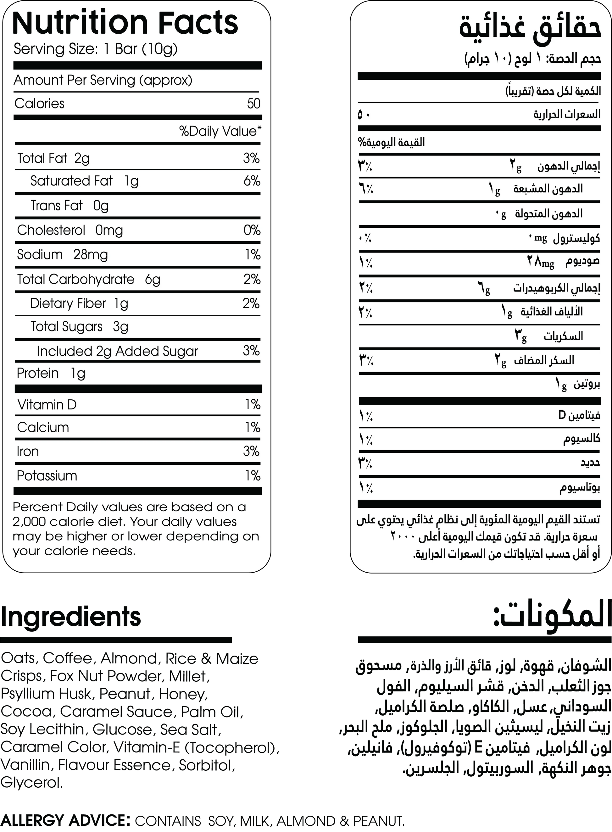 Oats, Coffee, Almond, Brown Rice, Maize Crisps, Fox Nut Powder, Millet, Psyllium Husk, Peanut, Honey, Cocoa, Caramel Sauce, Palm Oil, Soy Lecithin, Glucose, Sea Salt, Caramel Color, Vitamin-E (Tocopherol), Vanillin, Flavour Essence, Sorbitol, Glycerol.