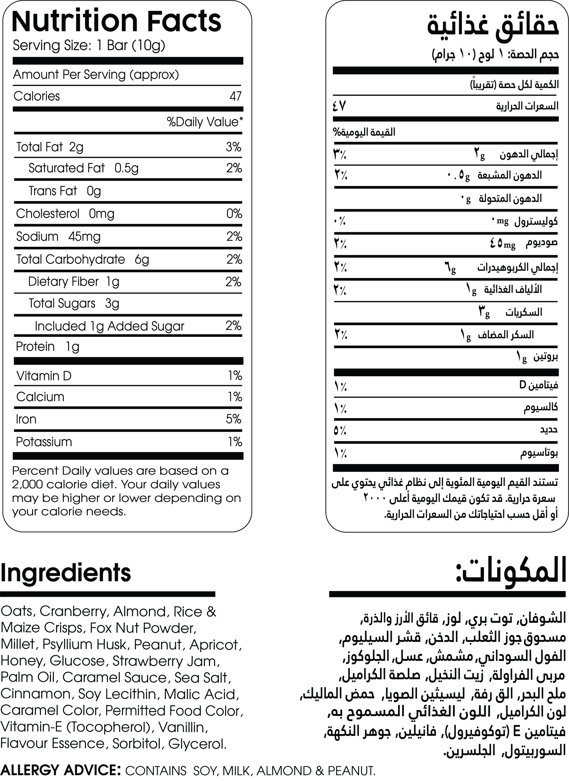 Oats, Cranberry, Almond, Brown Rice, Maize Crisps, Fox Nut Powder, Millet, Psyllium Husk, Peanut, Apricot, Honey, Glucose, Strawberry jam, Palm Oil, Caramel Sauce, Sea Salt. Cinnamon, Soya Lecithin, Malic Acid, Caramel Color, Beetroot Color, Vitamin-E (Tocopherol), Vanillin, Flavour Essence, Sorbitol, Glycerol.