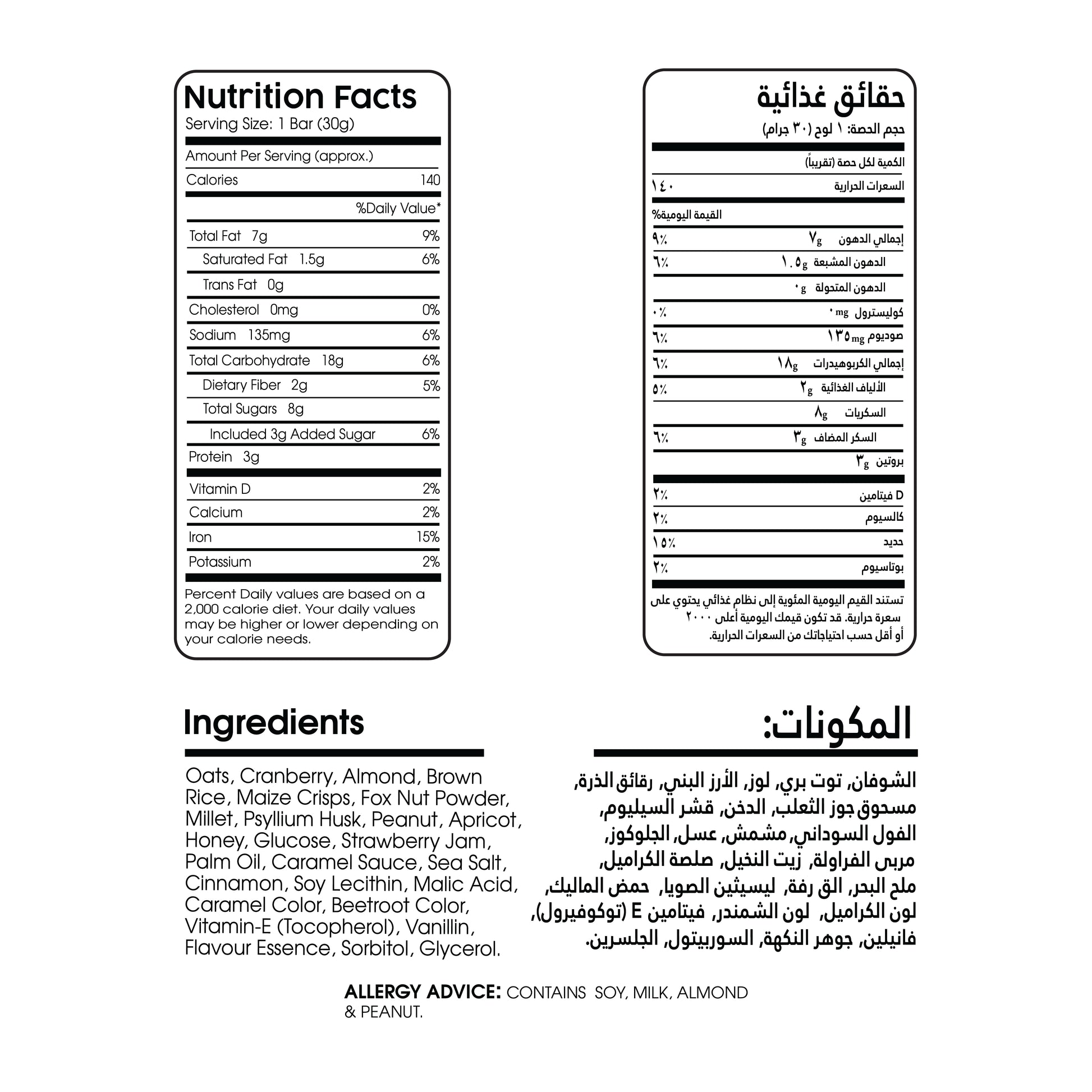 Oats, Cranberry, Almond, Brown Rice, Maize Crisps, Fox Nut Powder, Millet, Psyllium Husk, Peanut, Apricot, Honey, Glucose, Strawberry jam, Palm Oil, Caramel Sauce, Sea Salt. Cinnamon, Soya Lecithin, Malic Acid, Caramel Color, Beetroot Color, Vitamin-E (Tocopherol), Vanillin, Flavour Essence, Sorbitol, Glycerol.