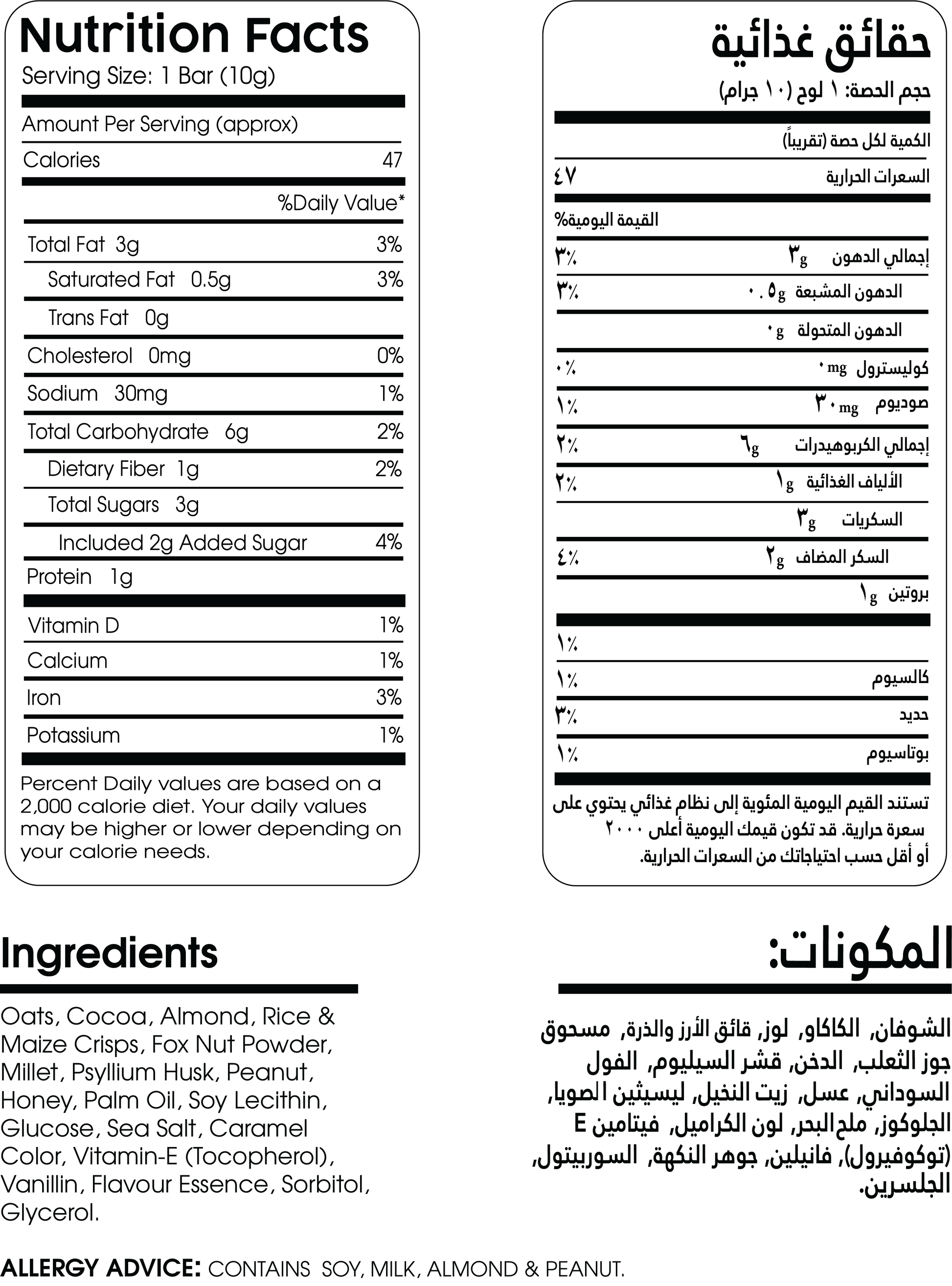 Oats, Cocoa, Almond, Brown Rice, Maize Crisps, Fox Nut Powder, Millet, Psyllium Husk, Peanut, Honey, Palm Oil, Soy Lecithin, Glucose, Sea Salt, Caramel Color, Vitamin-E (Tocopherol), Vanillin, Flavour Essence, Sorbitol, Glycerol.