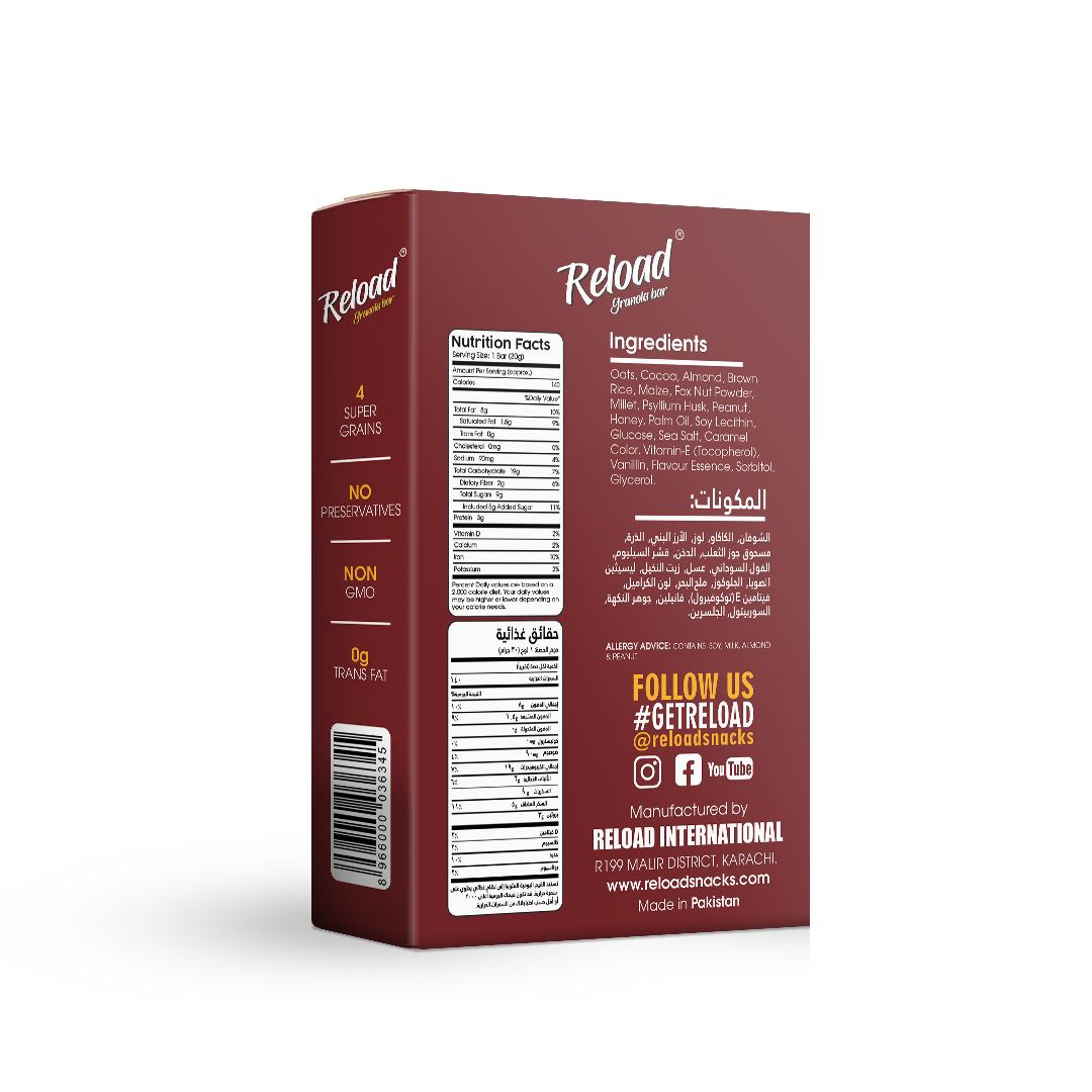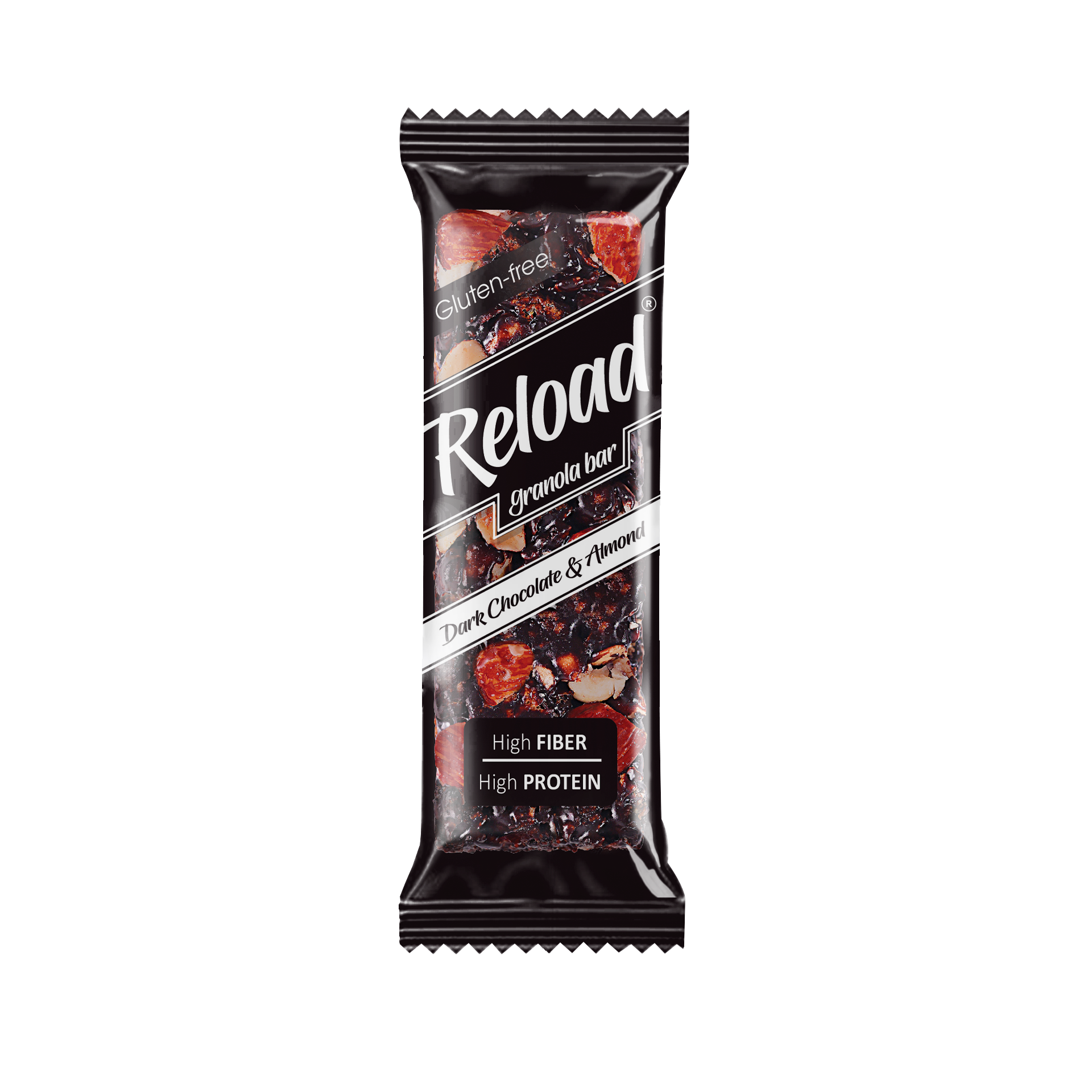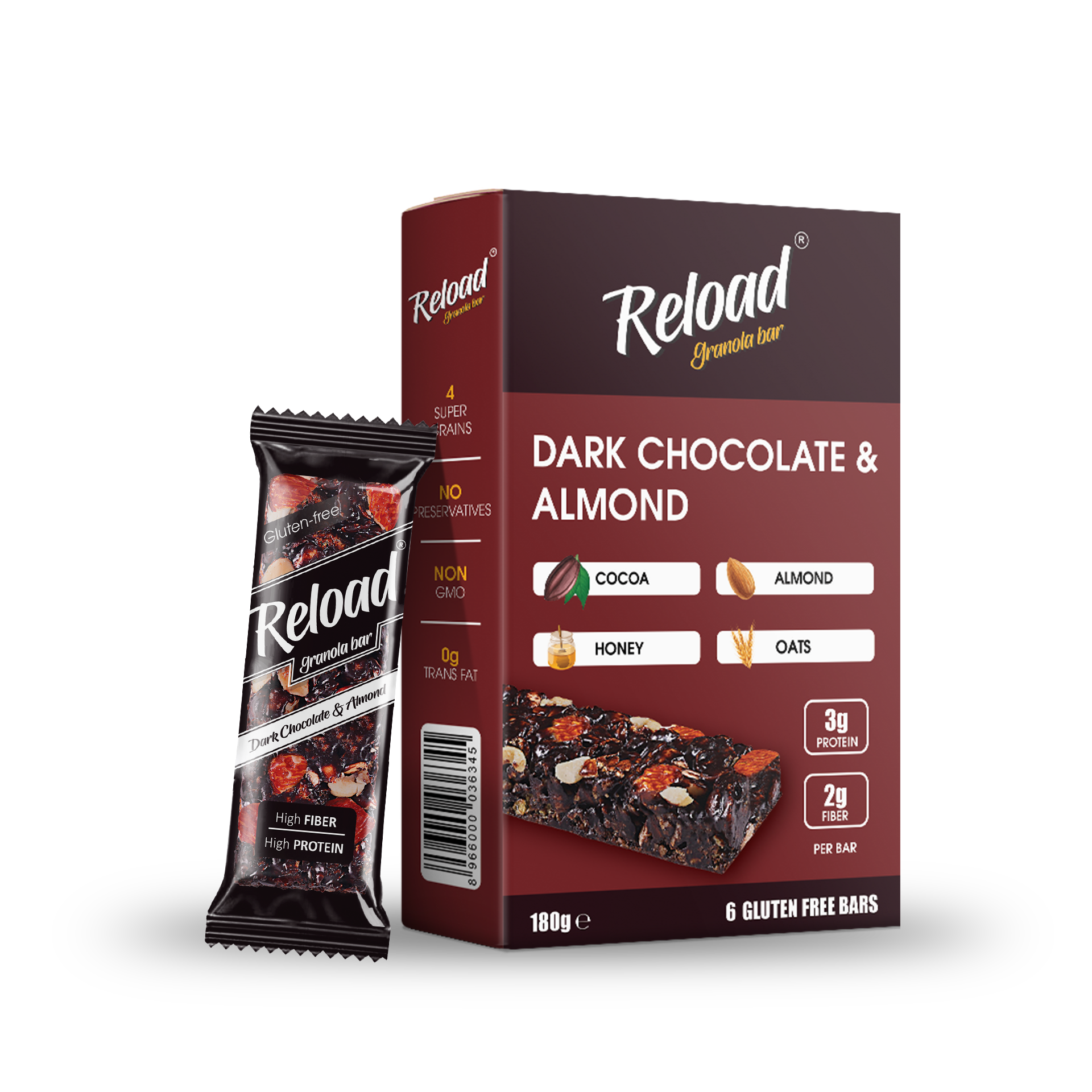 Reload pure Dark Chocolate Granola Bar is a healthy snack containing Fiber from Oats and Protein from roasted Nuts, giving you a perfect snack to stay in shape and enjoy a healthy lifestyle.
