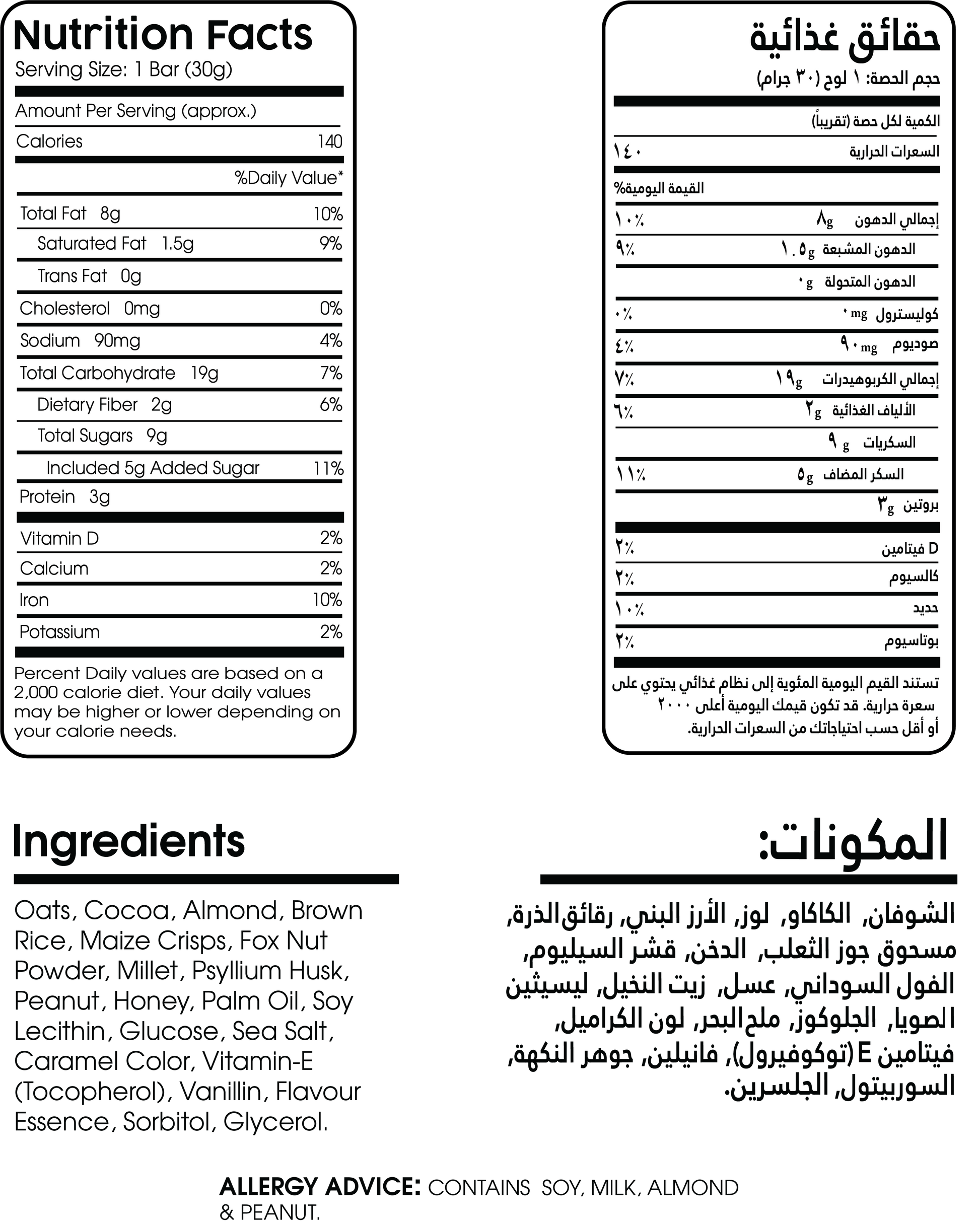 Oats, Cocoa, Almond, Brown Rice, Maize Crisps, Fox Nut Powder, Millet, Psyllium Husk, Peanut, Honey, Palm Oil, Soy Lecithin, Glucose, Sea Salt, Caramel Color, Vitamin-E (Tocopherol), Vanillin, Flavour Essence, Sorbitol, Glycerol.