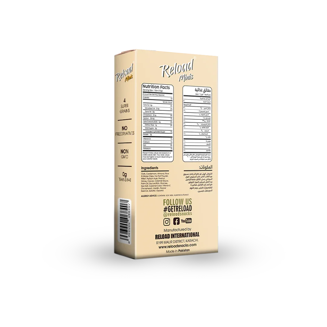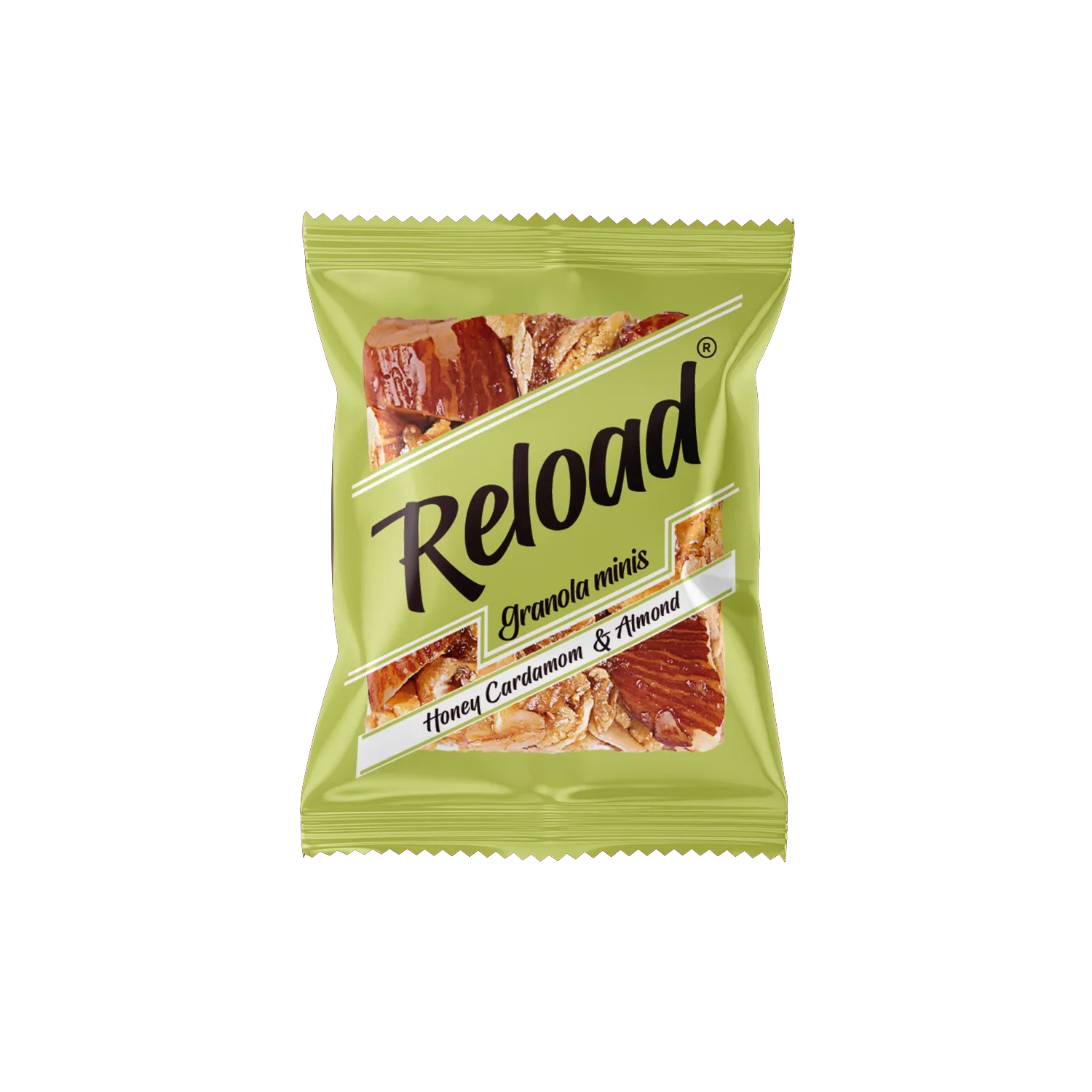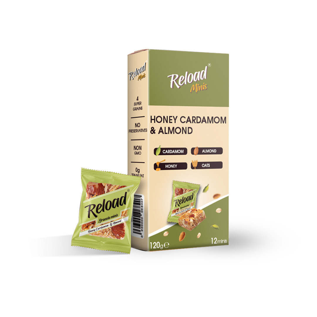 Reload pure Honey Cardamom & Almonds mini is a healthy snack containing Fiber from Oats and Protein from roasted Nuts, giving you a perfect snack to stay in shape and enjoy a healthy lifestyle.
