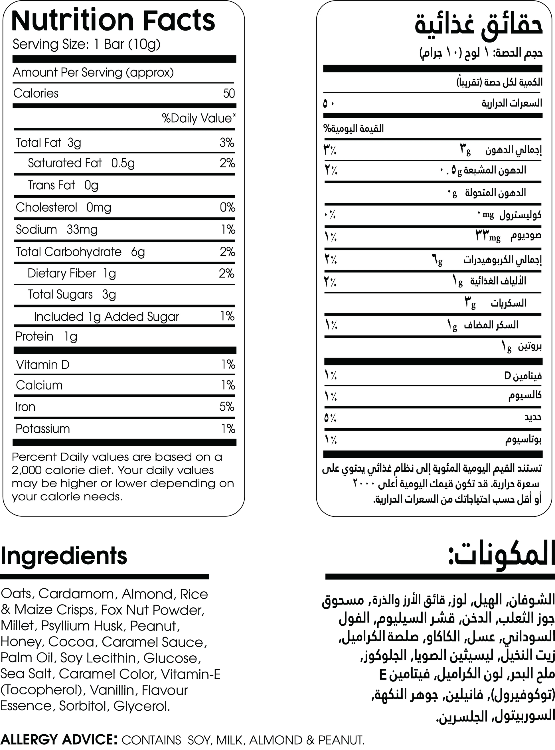 Oats, Cardamom, Almond, Brown Rice, Maize Crisps, Fox Nut Powder, Millet, Psyllium Husk, Peanut, Honey, Cocoa, Caramel Sauce, Palm Oil, Soy Lecithin, Glucose, Sea Salt, Caramel Color, Vitamin-E (Tocopherol), Vanillin, Flavour Essence, Sorbitol, Glycerol.