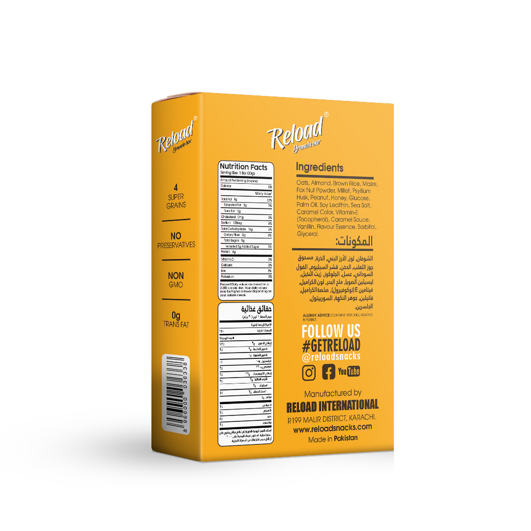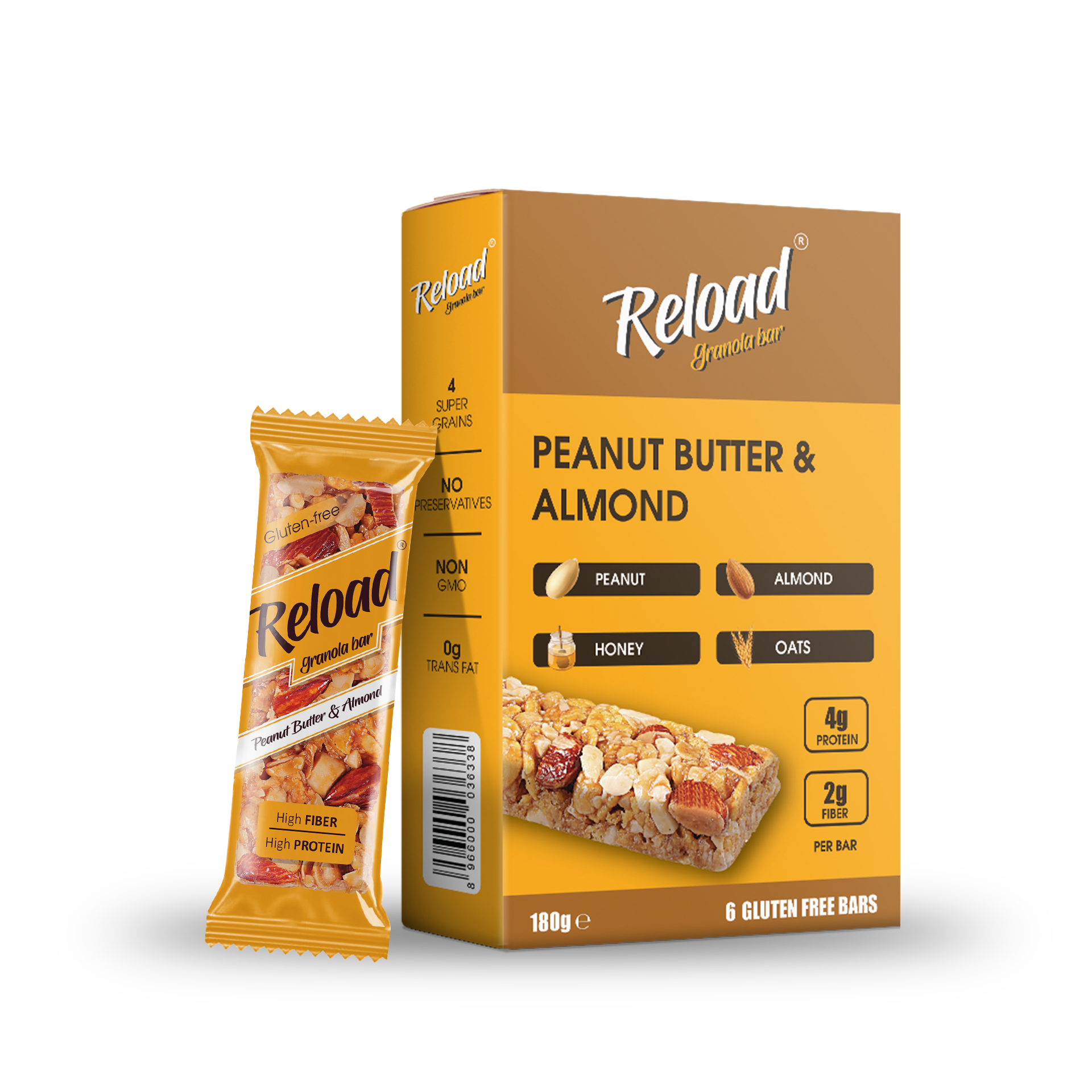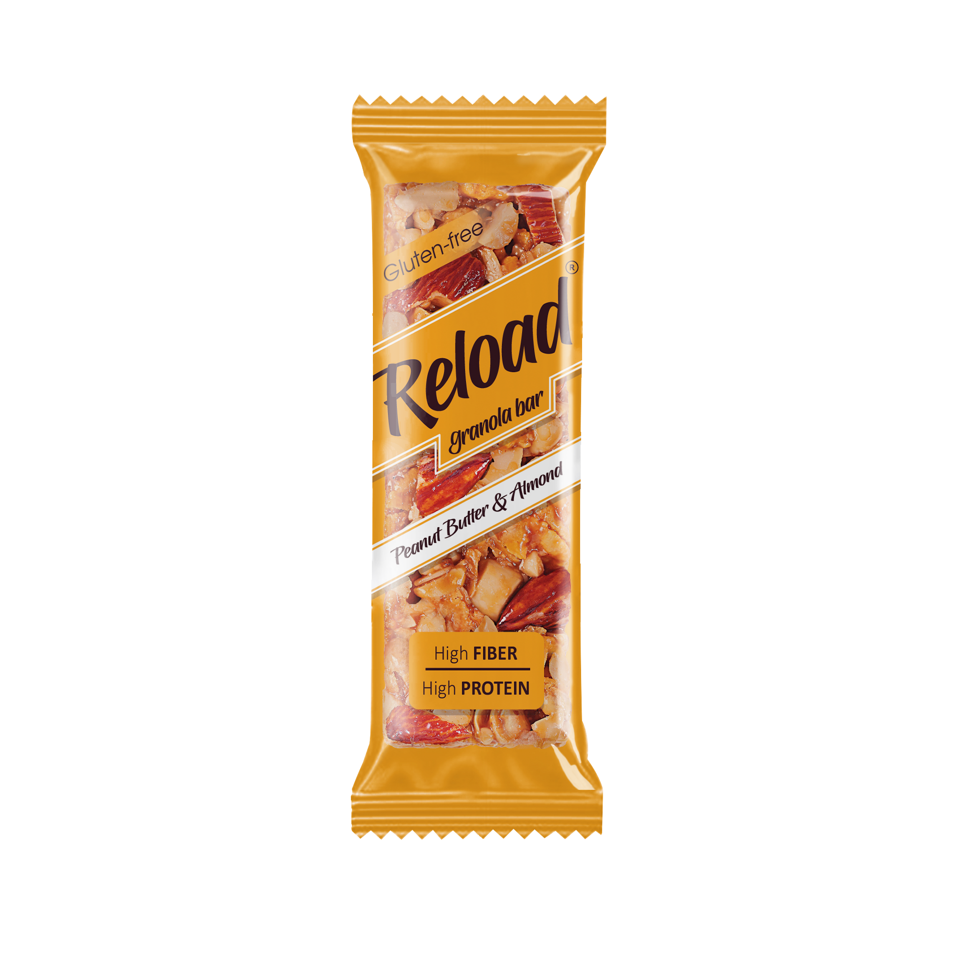 Reload Granola Bar is a healthy snack containing Fiber from Oats and Protein from roasted Nuts, giving you a perfect snack to stay in shape and enjoy a healthy lifestyle.