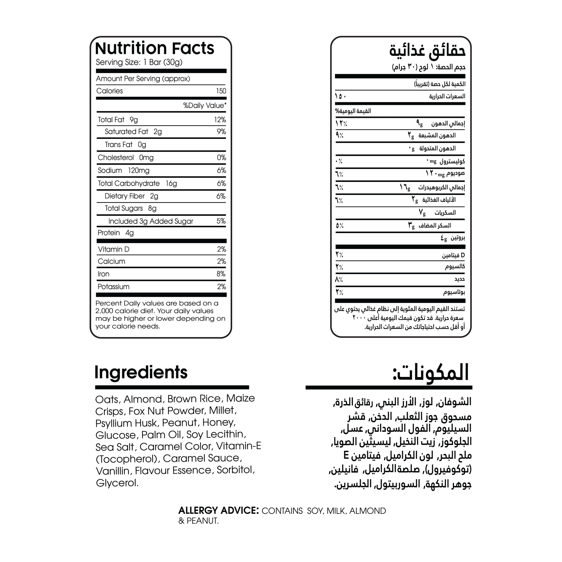 Oats, Almond, Brown Rice, Maize Crisps, Fox Nut Powder, Millet, Psyllium Husk, Peanut, Honey, Palm Oil, Soy Lecithin, Glucose, Sea Salt, Caramel Color, Vitamin-E (Tocopherol), Caramel Sauce, Vanillin, Flavour Essence, Sorbitol, Glycerol.