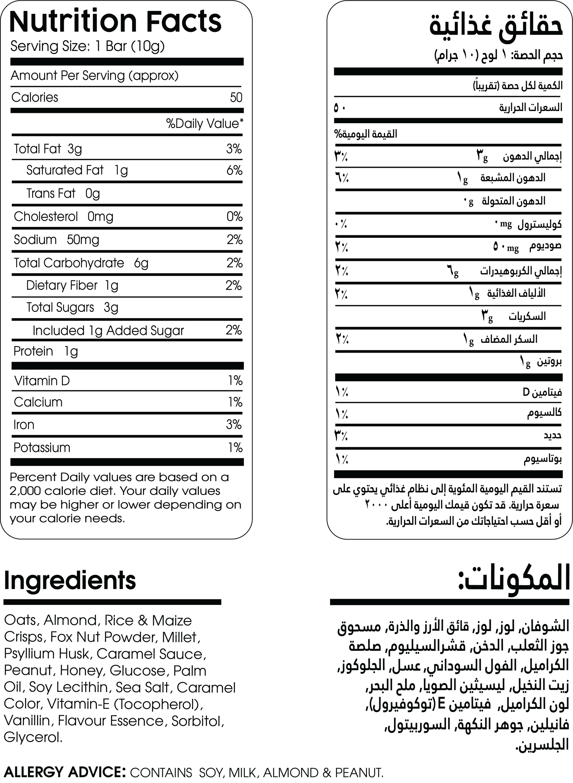 Oats, Almond, Brown Rice, Maize Crisps, Fox Nut Powder, Millet, Psyllium Husk, Caramel Sauce, Peanut, Honey, Palm Oil, Soy Lecithin, Glucose, Sea Salt, Caramel Color, Vitamin-E (Tocopherol), Vanillin, Flavour Essence, Sorbitol, Glycerol.