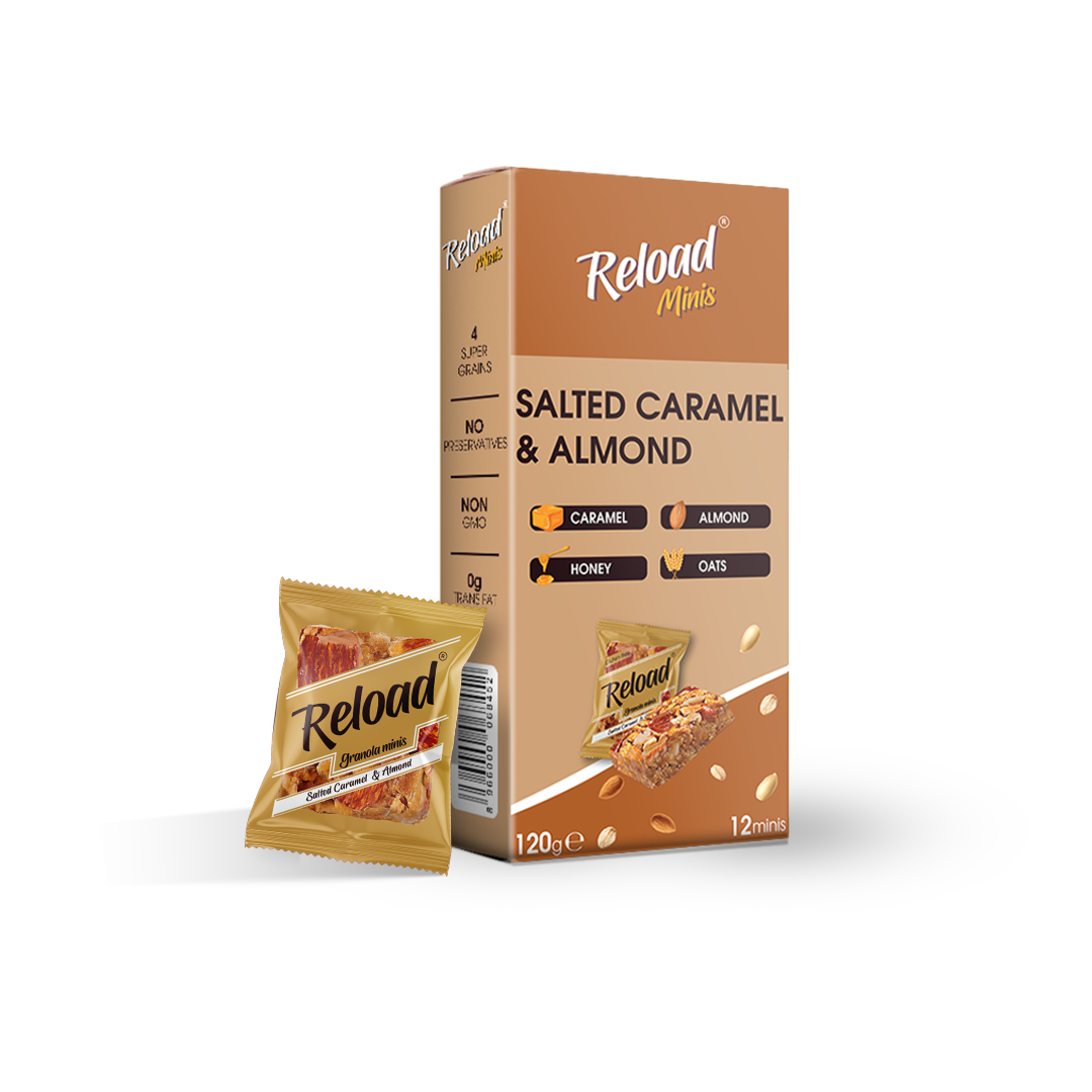 Reload pure Salted Caramel Granola Mini is a healthy snack containing Fiber from Oats and Protein from roasted Nuts, giving you a perfect snack to stay in shape and enjoy a healthy lifestyle.